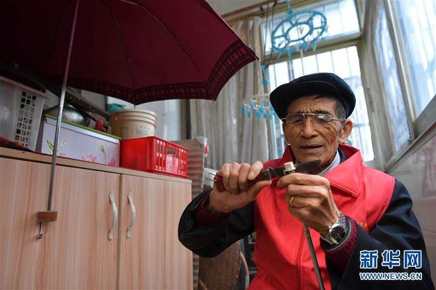 在江西省南昌市新建区花果山社区,况亮在家中修理雨伞(12月18日摄)。