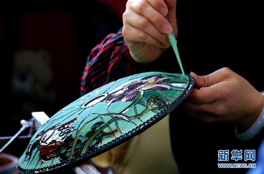 12月4日,北京市珐琅厂有限责任公司的景泰蓝技师在第一遍烧制过的基础上进行第二次上色。 新华社记者 李欣 摄