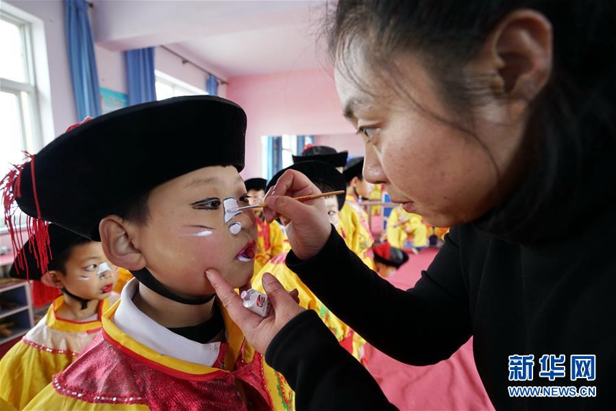 12月19日,河北省滦州市小闫营小学教师在为排练地秧歌的学生化妆。新华社记者 牟宇 摄