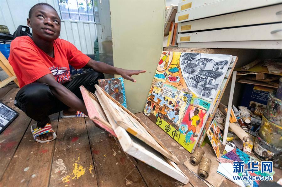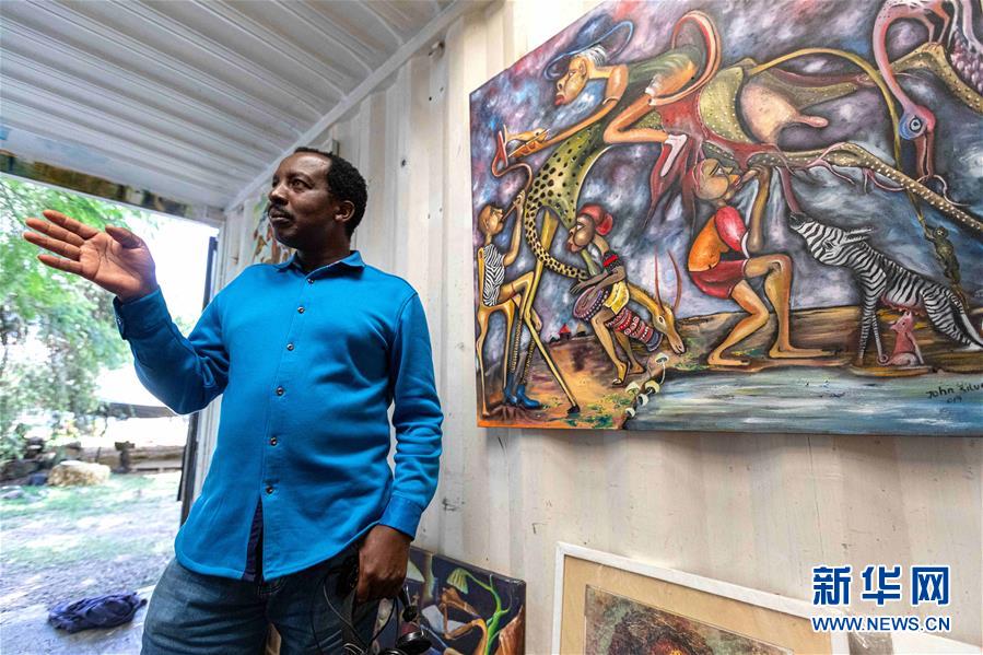 12月20日,在肯尼亚内罗毕库奥纳艺术中心,一名画家介绍自己的作品。 新华社记者 王腾 摄