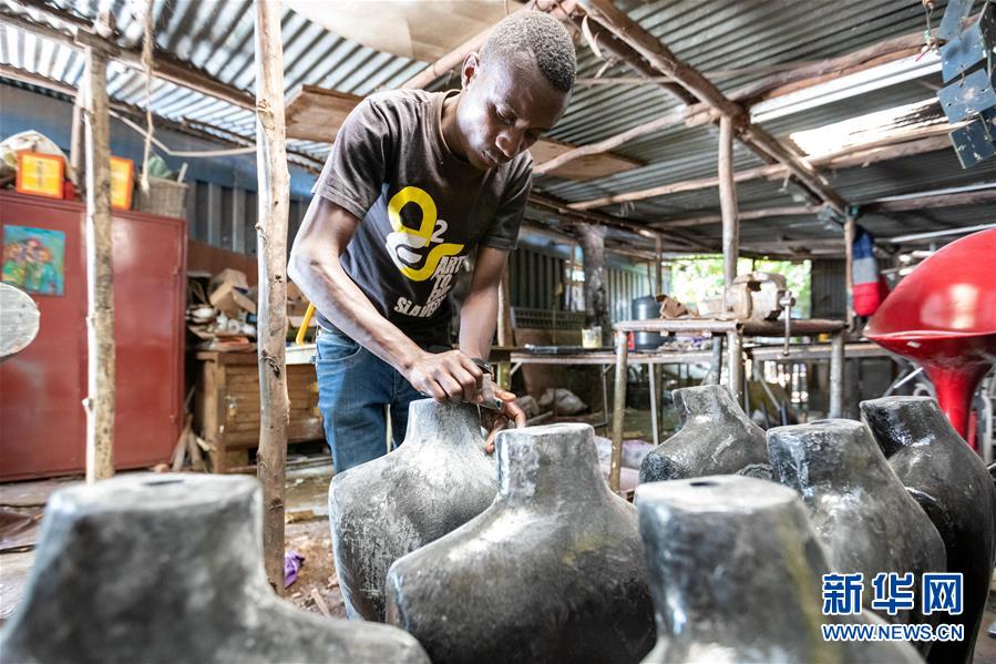 12月20日,在肯尼亚内罗毕库奥纳艺术中心,一名艺术家制作装置艺术作品。 新华社记者 王腾 摄