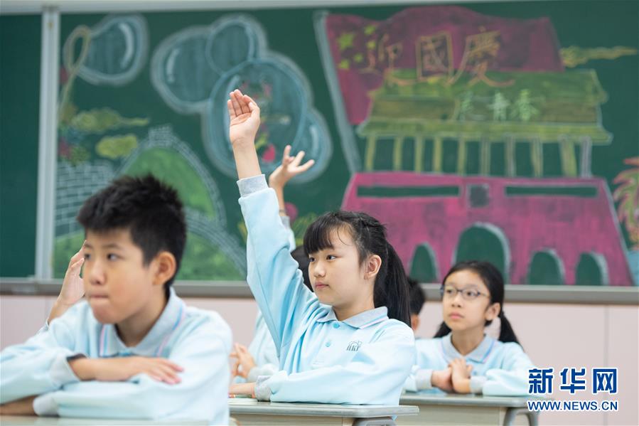 11月25日,喻彦茜(中)在课堂上举手回答老师提问。