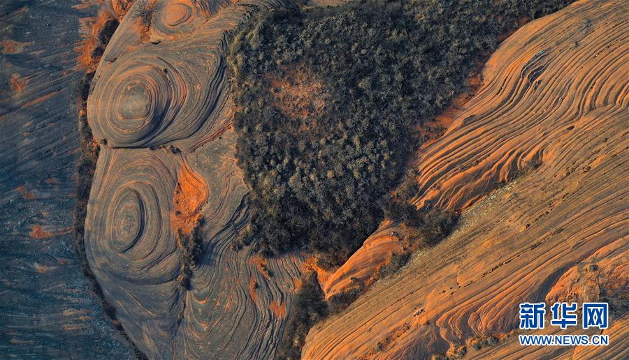 这是12月16日无人机拍摄的陕西省志丹县杏河镇丹霞地貌“螺旋谷”。 在陕西省延安市志丹县杏河镇有一片美丽的丹霞地貌,这里山峦起伏,沟壑纵横,一些红砂石呈现出大小不同的螺旋状纹理,让人叹为观止。 新华社记者陶明摄