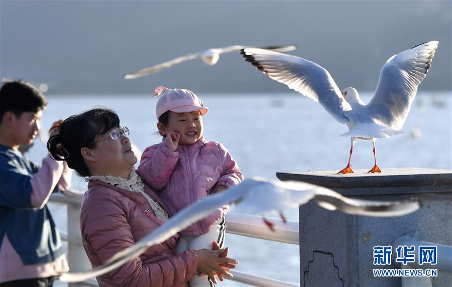 12月18日,人们在昆明海埂大坝观赏、投喂红嘴鸥。 近日,“春城”昆明阳光明媚,气候宜人,市民游客纷纷来到海埂大坝、翠湖公园等地,与前来越冬的红嘴鸥近距离接触,人鸥同乐。红嘴鸥是云南昆明的“荣誉市民”,每年秋冬季都会来到昆明越冬。 新华社记者 蔺以光 摄