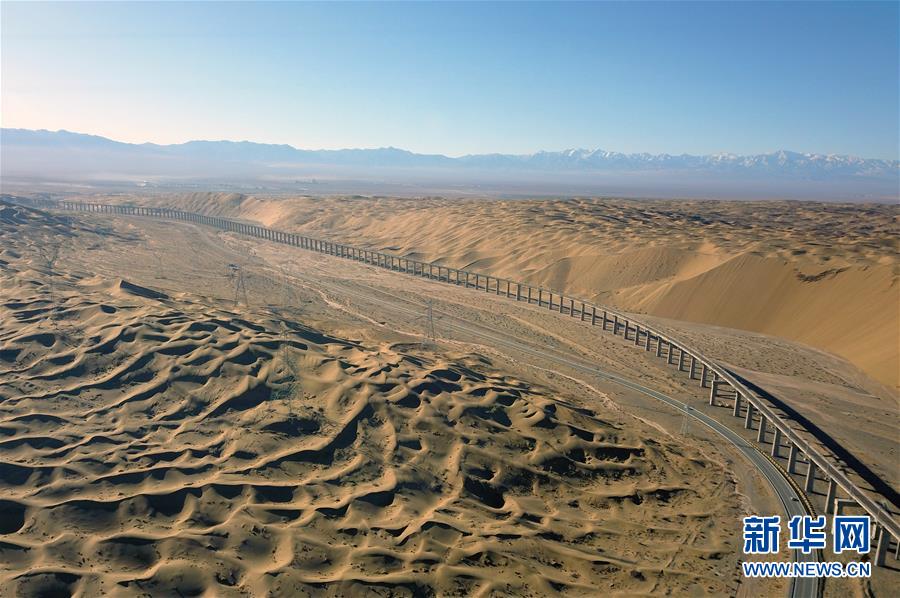 这是敦格铁路沙山沟特大桥(12月11日无人机拍摄)。 敦(煌)格(尔木)铁路沙山沟特大桥位于甘肃省酒泉市阿克塞哈萨克族自治县境内的库姆塔格沙漠内,是一座穿越活动性沙漠地区的特长桥梁,也是敦格铁路的重难点控制工程。据介绍,桥梁所在区域风沙活动频繁,四季及昼夜温差大,在建设过程中,中铁十一局集团有限公司的建设者根据沙层的厚度、分布及含水率的不同,总结出一套沙丘桩基施工工艺。 新华社记者 范培珅 摄