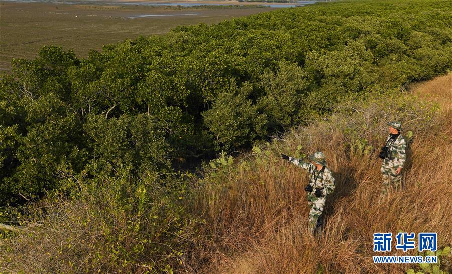 海南儋州新英湾红树林市级自然保护区护林员陈正平(前)和同伴巡护保护区内的红树林(12月9日摄)。陈正平2010年开始在保护区工作,他将工作发展成爱好,广泛参加各种培训和业内交流。他在工作中拍到濒危鸟类白肩雕出现在海南的照片,这刷新了海南省的鸟种记录。新华社记者杨冠宇摄