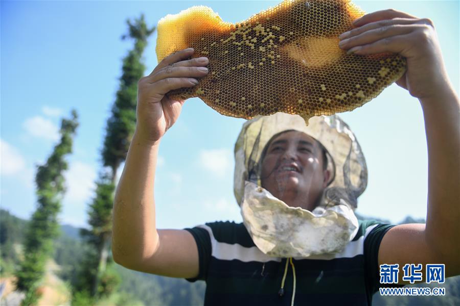 32岁的龙先兰在十八洞村一处蜜源点查看蜂巢(9月4日摄)。一度贫困的湖南十八洞村人龙先兰在精准脱贫工作队的帮助下,学习养蜂技术,发展养蜂产业,逐渐成为养蜂大户,带动118户养蜂户脱贫致富。新华社记者陈泽国摄