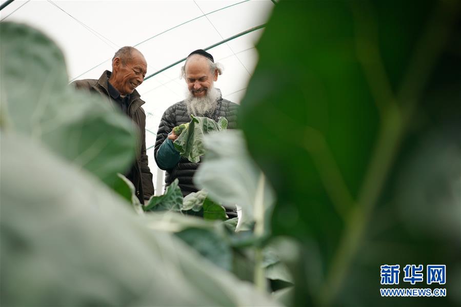 以色列专家(右)在河北省邢台市威县枣元乡蔬菜种植基地内指导曾经的贫困户查验蔬菜长势(11月27日摄)。威县自2018年9月退出贫困县序列以来,通过推进兴产业、强就业、促创业、发展手工业“四业”富民工程,逐步构建精准防返贫长效机制。新华社记者牟宇摄
