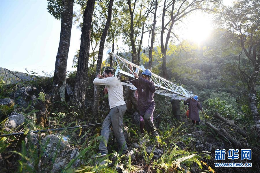 在广西大化瑶族自治县板升乡八好村,工人抬着电线塔上山,准备对线路进行升级改造(11月11日摄)。石山面积占全县总面积90%以上的广西大化瑶族自治县是广西极度贫困县之一。面对经济发展落后的情况,当地调动社会各方力量,攻坚克难,推进易地扶贫搬迁、危旧房改造、水柜建设和村屯道路建设,确保贫困群众早日脱贫。新华社记者黄孝邦摄