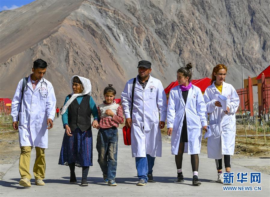 新疆塔什库尔干塔吉克自治县达布达尔乡热斯喀木村村医发尔亚特·塔西白克(右三)与医务人员来到当地易地扶贫搬迁安置点出诊(7月7日摄)。随着医疗扶贫的推进,新疆牧区的医疗条件和水平大幅提升,牧民享受到越来越多、越来越便利的医疗惠民服务。新华社记者胡虎虎摄