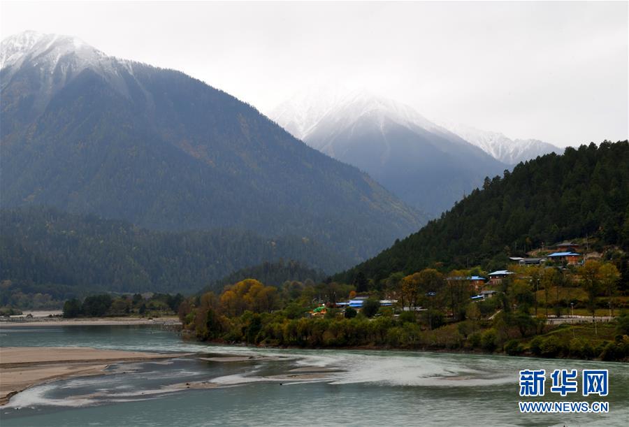 西藏波密县境内古乡湖畔的雪山、彩林和民居(10月25日摄)。新华社记者陈天湖摄