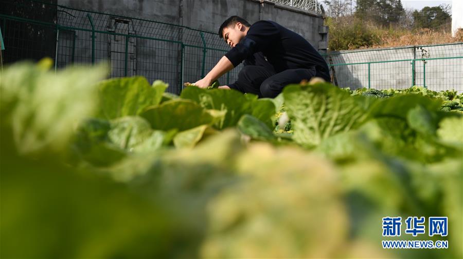 金寨火车站派出所民警吕锦鹏在菜园摘菜(12月19日摄)。由于金寨火车站派出所离县城较远,平时买菜不方便,民警们在院子里开垦了一处小菜园。新华社记者张端摄