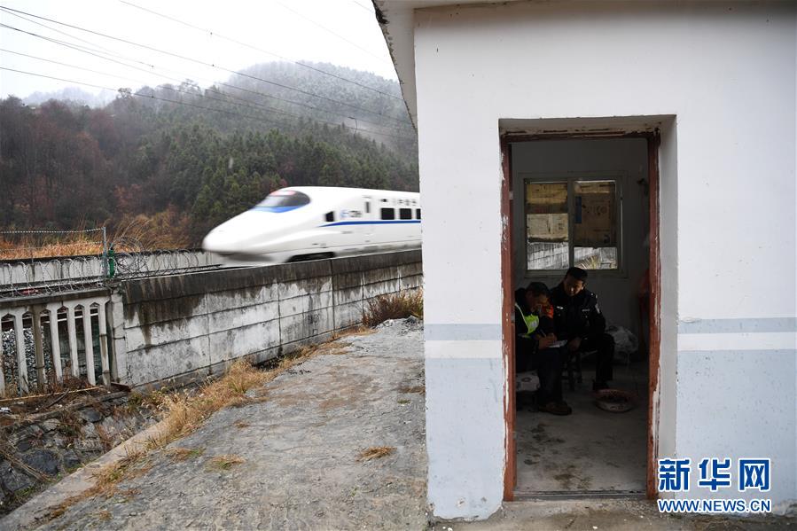 12月18日,常晓龙(右)和辅警在治安岗亭里交流。新华社记者刘军喜摄