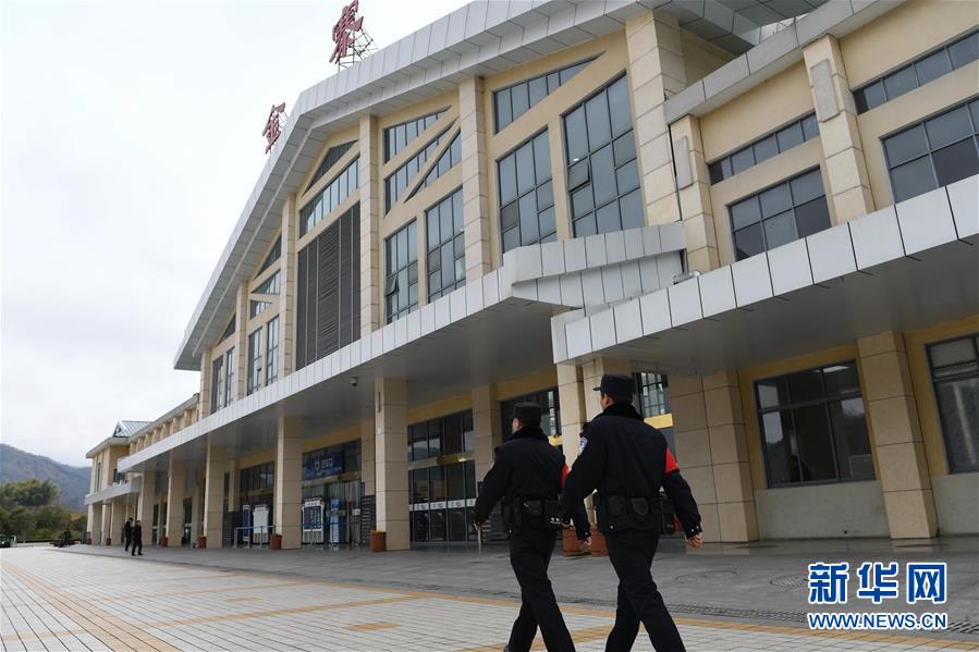 金寨火车站派出所民警何津超(左)和王晨旭在站前广场执勤(12月19日摄)。新华社记者张端摄