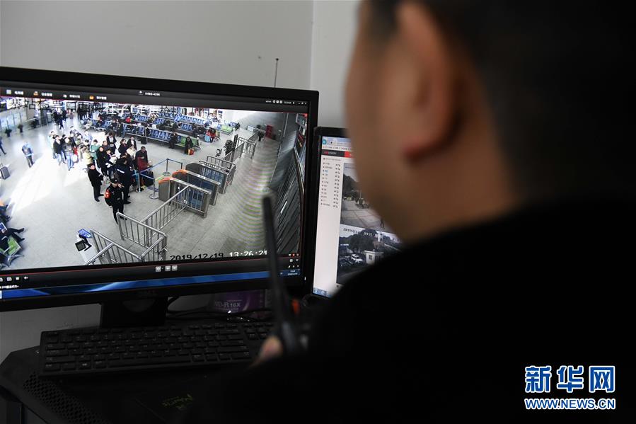 金寨火车站派出所民警何津超通过监控视频了解候车大厅内的实时情况(12月19日摄)。新华社记者张端摄