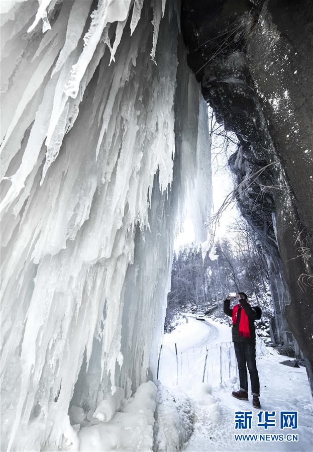 1月9日,游客在云台山景区拍摄冰瀑景观。近日,受降温影响,位于河南省焦作市的云台山景区出现冰瀑景观,奇特壮美。新华社记者冯大鹏摄