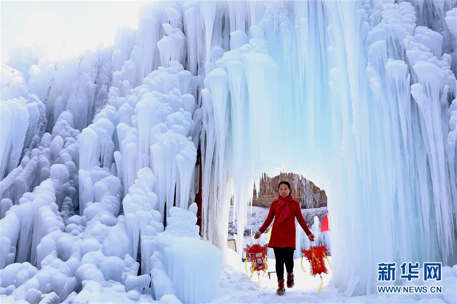 2月25日,游客在观赏冰瀑景观。去冬今春以来,黑龙江省镜泊湖的吊水楼冰瀑景色壮观,吸引许多游人前来观赏。新华社记者王建威摄
