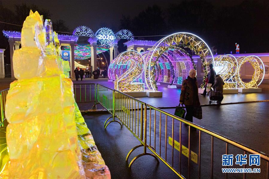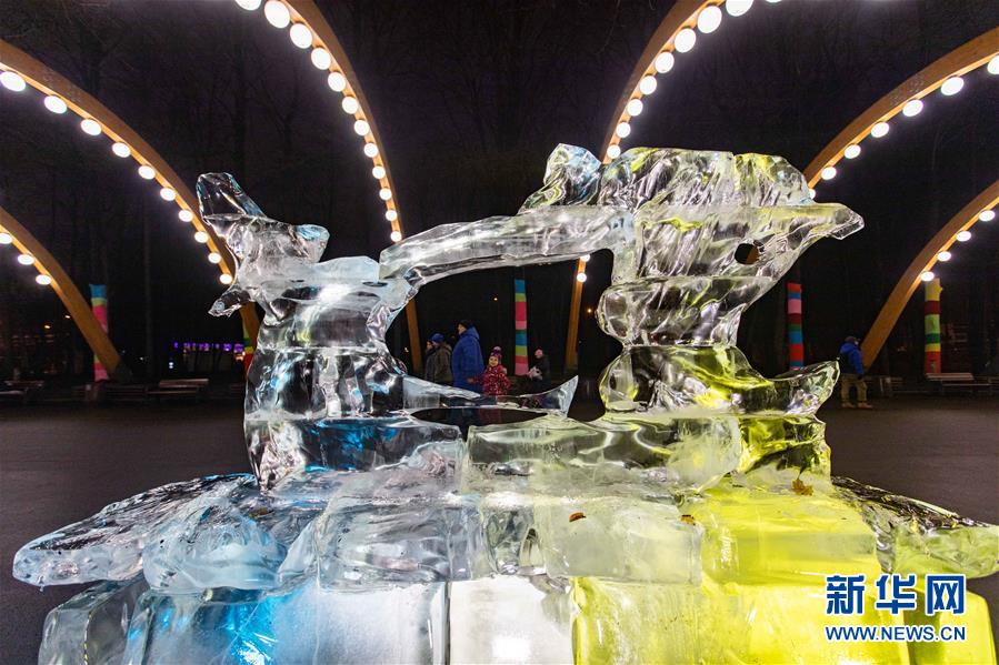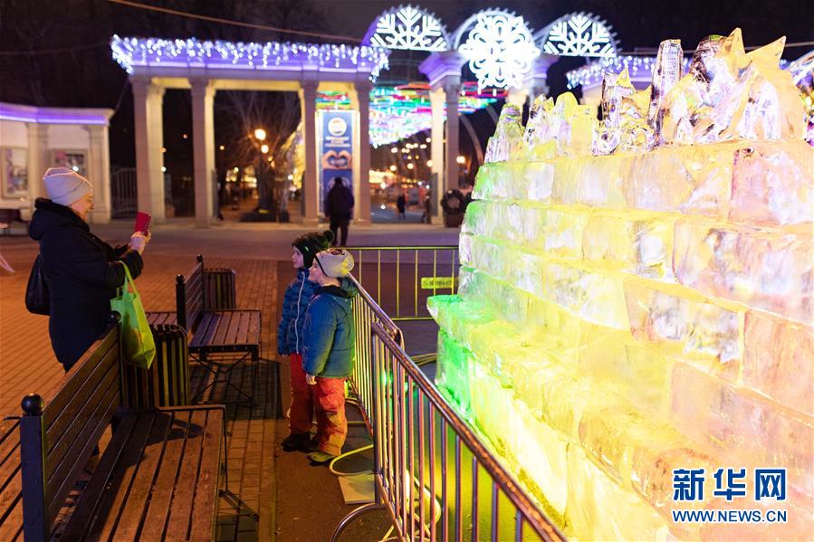 12月24日,在俄罗斯首都莫斯科,人们参观冰雕艺术展。 新华社记者 白雪骐 摄