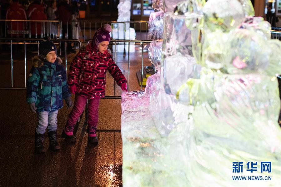 12月24日,在俄罗斯首都莫斯科,小朋友参观冰雕艺术展。 哈尔滨冰雕艺术展24日在莫斯科开幕,现场展出了哈尔滨大剧院、防洪纪念塔以及莫斯科红场建筑群等惟妙惟肖的冰雕作品,吸引众多游客驻足拍照。 参加本次冰雕艺术展的十名冰雕师提前抵达莫斯科,以新中国成立70周年、中俄建交70周年、“一带一路”倡议等为主题,为莫斯科民众奉上了精美的新年礼物。 新华社记者 白雪骐 摄