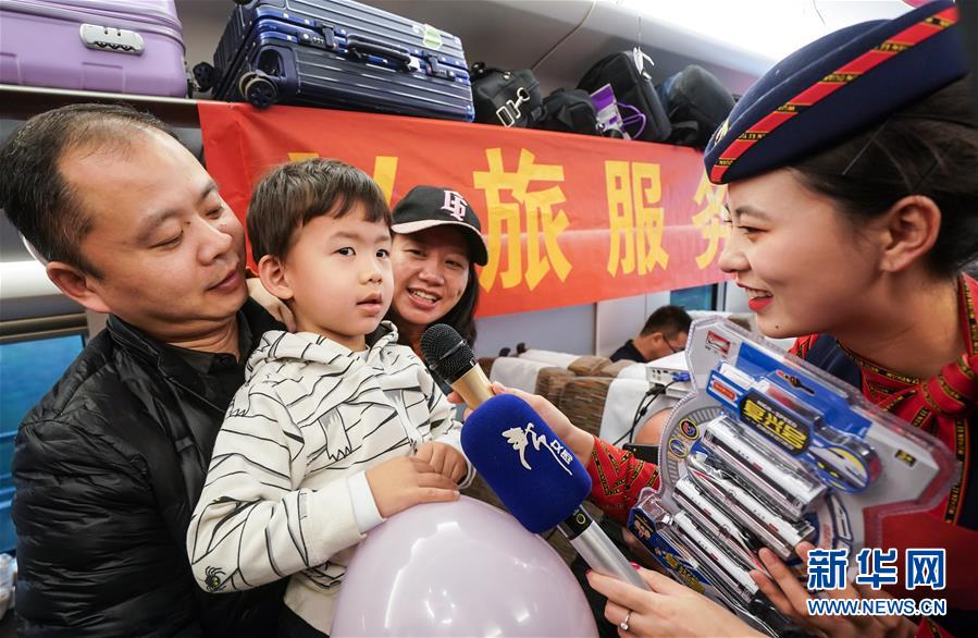 12月25日,乘务人员和小乘客互动。 新华社记者 程敏 摄