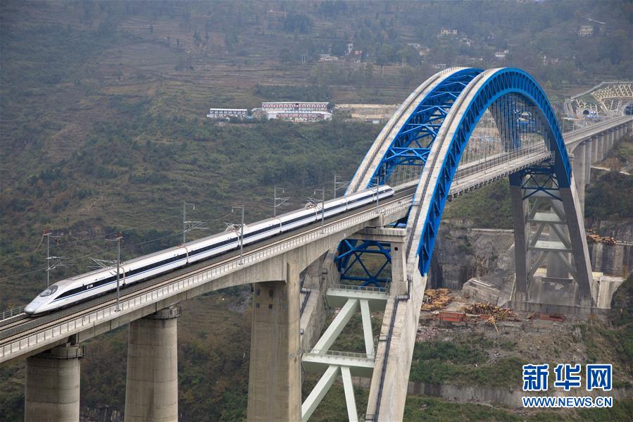 12月2日,一辆试验列车驶过成贵高铁鸭池河特大桥。当日,正在进行联调联试的成贵高铁进入全线拉通空载模拟运行阶段,试验列车将在成都到贵阳区间内全线路运行。线路全长650公里的成贵高铁是我国“八纵八横”高速铁路网的重要组成部分,设计时速为250公里。新华社记者刘续摄