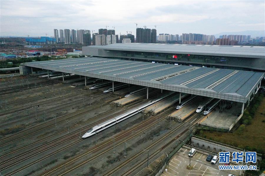 12月26日,昌赣高铁开通运营首日开出的首趟G5025次列车从南昌西站驶出(无人机拍摄)。新华社记者彭昭之摄