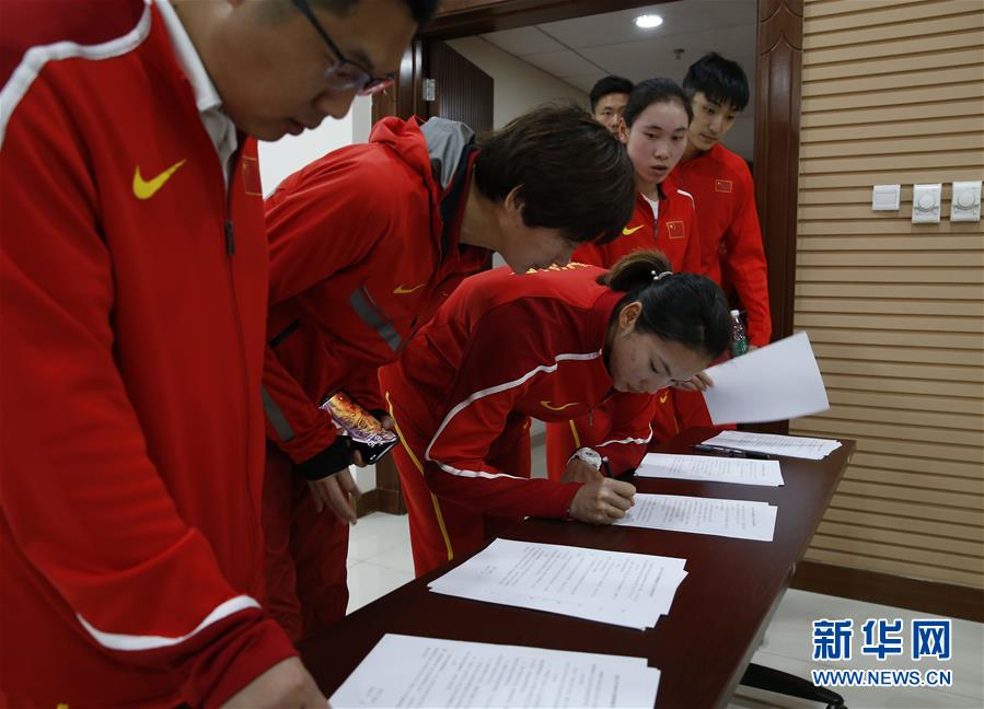 图为4月17日,中国田径队队员在签署《2019年多哈田径亚锦赛运动员反兴奋剂承诺书》。 新华社记者 丁旭 摄