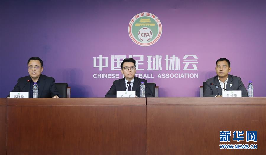 图为10月16日,中国足协秘书长刘奕(中)、职业联盟筹备组召集人黄盛华(右)、中国足协执委戴晓微在发布会上。当日,中国足协在北京召开新闻发布会,介绍职业联盟筹备情况。 新华社记者 曹灿 摄
