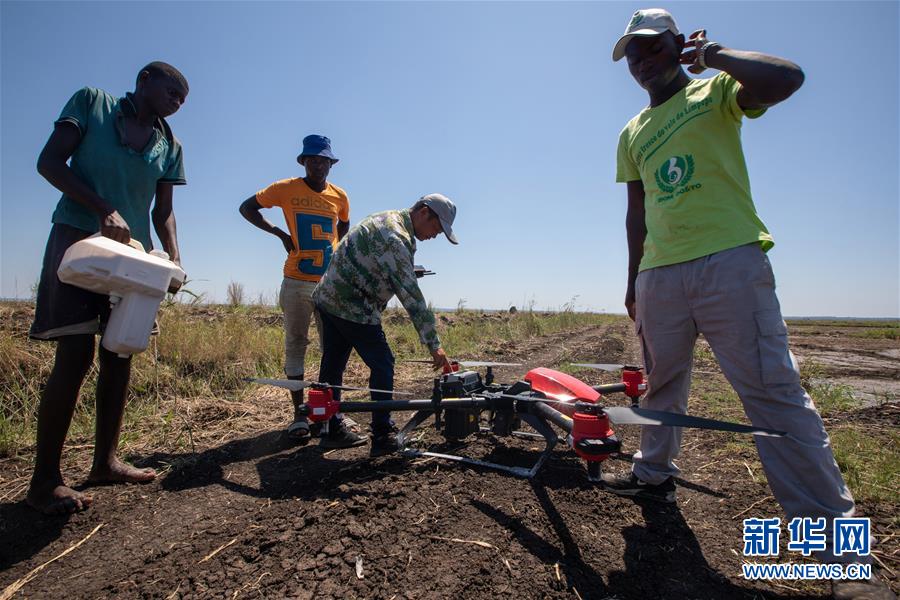 11月28日,在莫桑比克的万宝莫桑农业园,中国农业专家(右二)指导当地工人使用无人机喷洒除草剂。万宝莫桑农业园是中国在非洲最大规模水稻种植项目。中国的杂交水稻技术国际领先,已在世界上几十个国家和地区试验和推广,成为援助发展中国家的重要项目之一。 新华社记者 张宇 摄