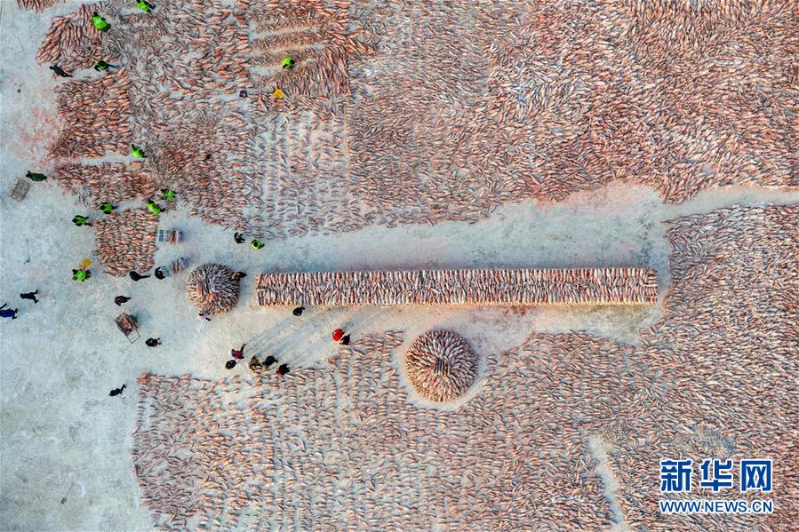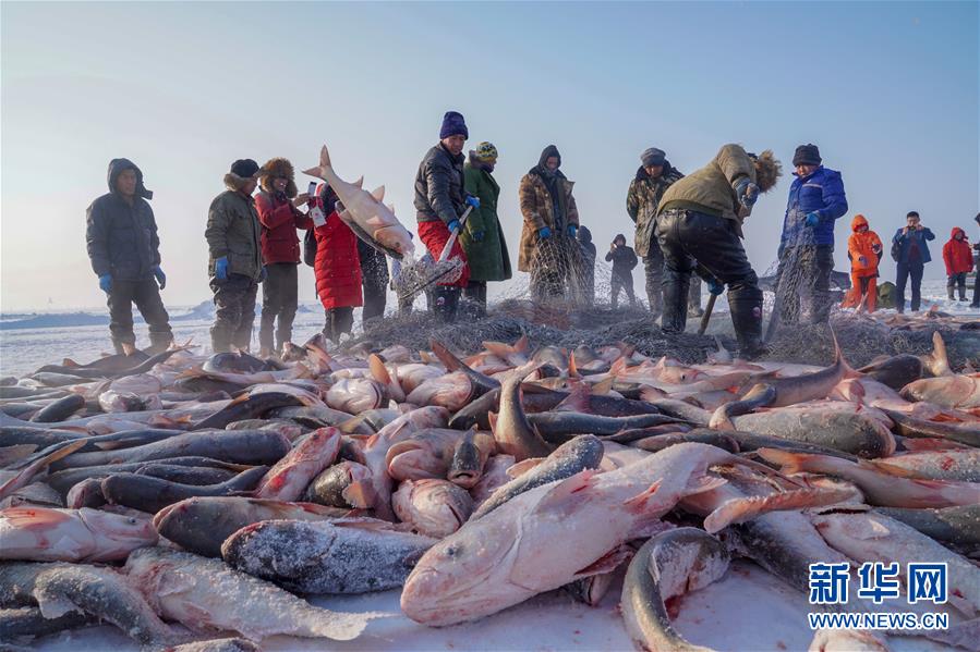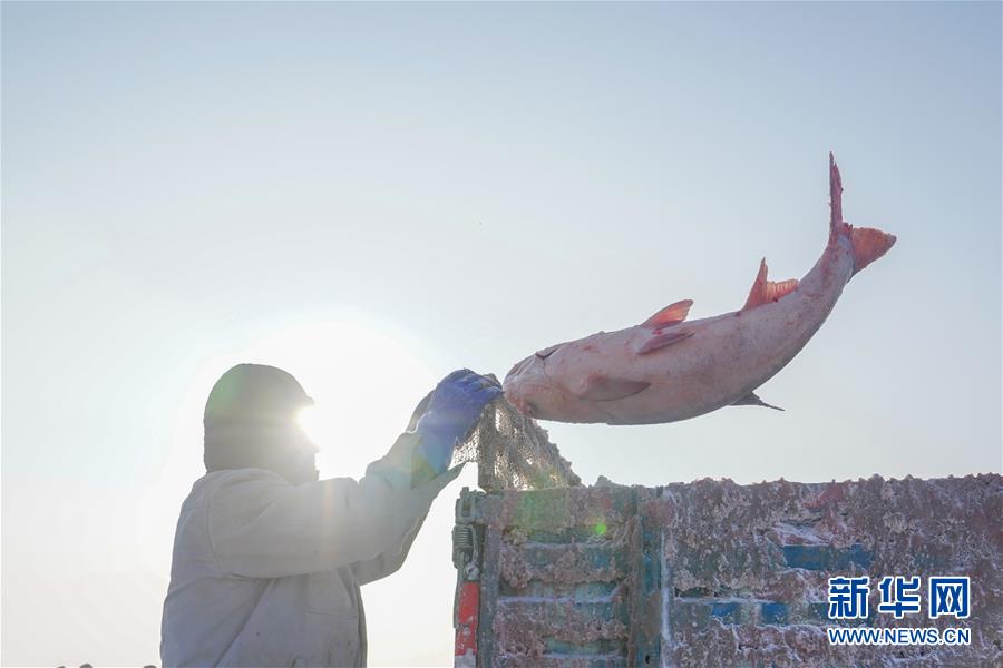 12月27日,在查干湖冰面上,工人将刚打捞上来的大鱼扔上货车。新华社记者张楠摄