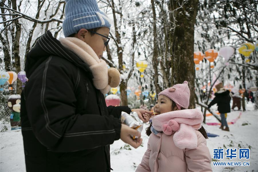 12月28日,小朋友在峨眉山风景名胜区吃零食。新华社记者李梦馨摄