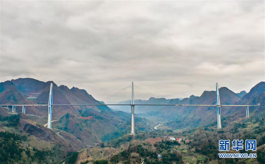 这是12月29日拍摄的贵州平塘特大桥(无人机照片)。目前,贵州平塘至罗甸高速公路控制性工程平塘特大桥已经通过验收,将于近日全桥通车。平塘特大桥全长2135米,桥面宽30.2米,规划双向4车道,是一座三塔双索面叠合梁斜拉桥。三座桥塔的高度分别为320米、332米和298米,相当于在峡谷之中建了三座100多层高的大楼。新华社记者刘续摄
