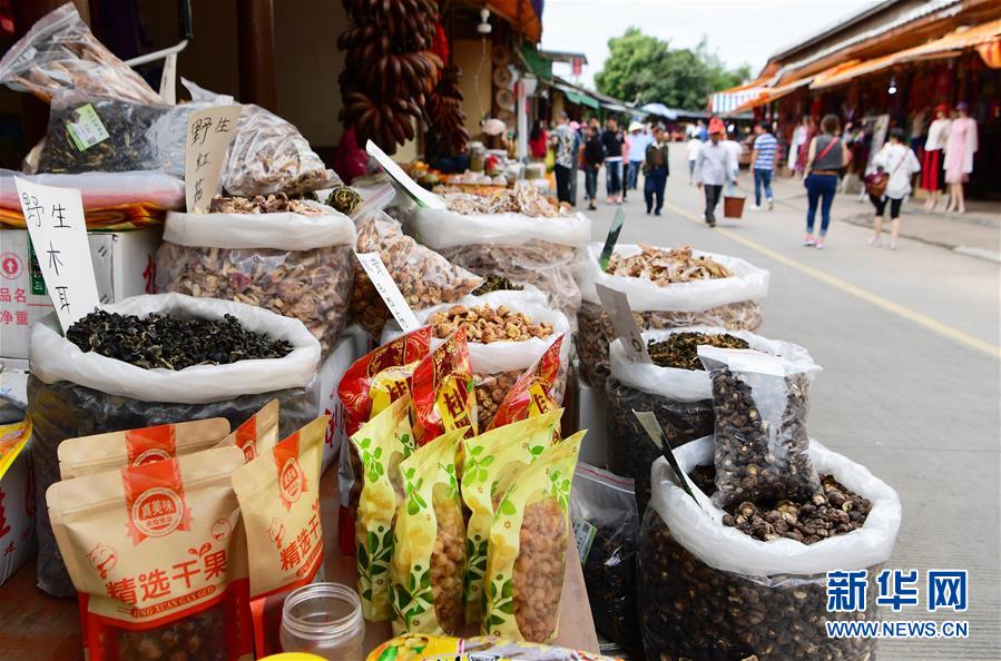 在龙岩市永定区湖坑镇高头乡高北村的土楼风情一条街,当地村民把自己生产的各式农产品向参观游客进行销售(5月4日摄)。新华社记者魏培全摄