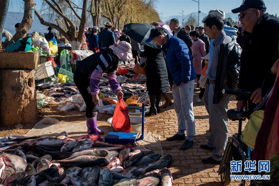 12月25日,人们在星云湖畔的老河咀鱼市选购刚捕捞的鲜鱼。新华社记者胡超摄