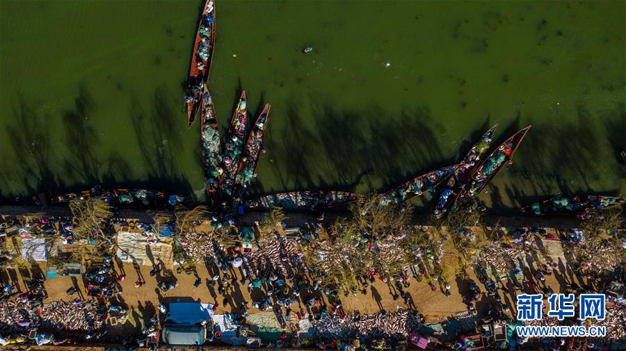 星云湖畔的老河咀鱼市热闹非凡(12月25日无人机拍摄)。新华社记者胡超摄