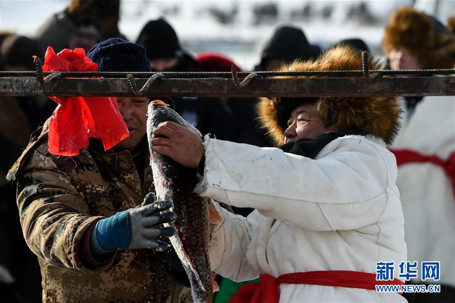 12月18日,工作人员将冬捕鱼打捞上岸。当日,位于内蒙古呼伦贝尔大草原上的诺干湖举行冬捕活动,吸引不少游客前来观看。冬日的诺干湖冰雪覆盖,诺干湖冬捕也是当地冬季旅游的特色活动之一。新华社记者刘磊摄