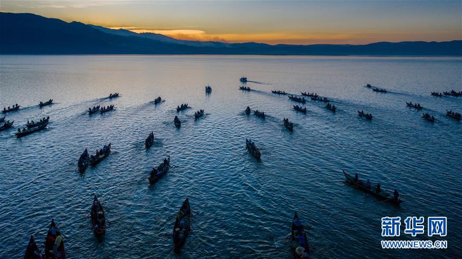12月25日,渔船驶入星云湖(无人机拍摄)。当日,位于云南省玉溪市江川区的星云湖迎来一年一度的开湖捕鱼季,600余艘渔船驶入星云湖捕捞。星云湖是云南省九大高原湖泊之一,本次开湖捕鱼时间将从2019年12月25日持续至2020年1月23日。新华社记者胡超摄
