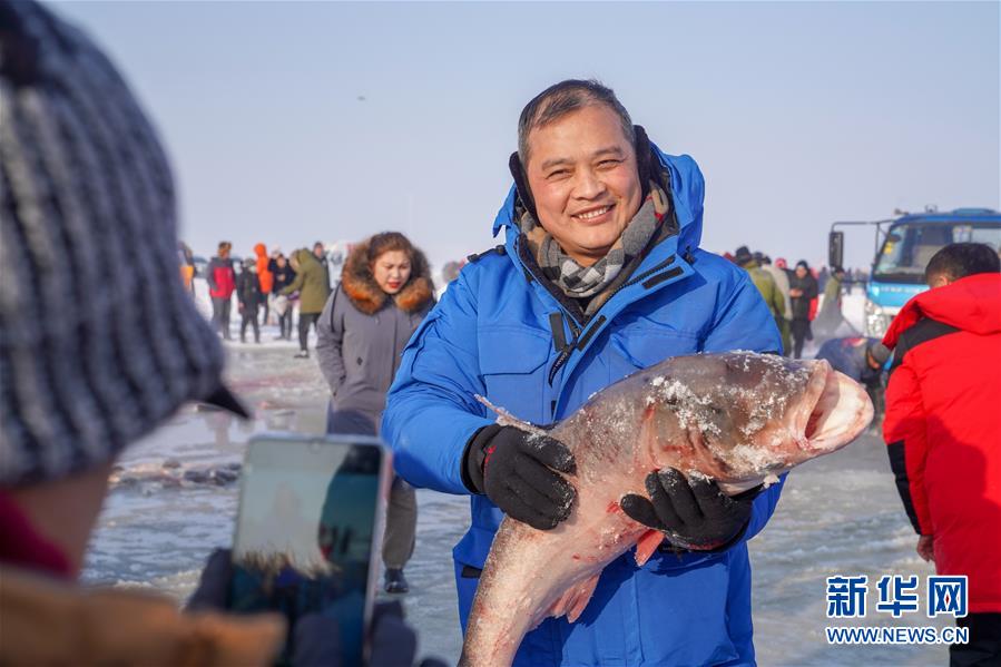 12月27日,在查干湖冰面上,游客手捧刚打捞上来的大鱼拍照留念。新华社记者张楠摄