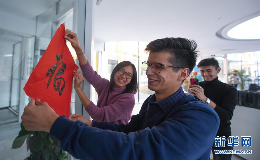 12月27日,来自俄罗斯的留学生阿布(中)在瓜山新苑社区活动中心与中国青年一起贴福字。新华社记者 徐昱 摄