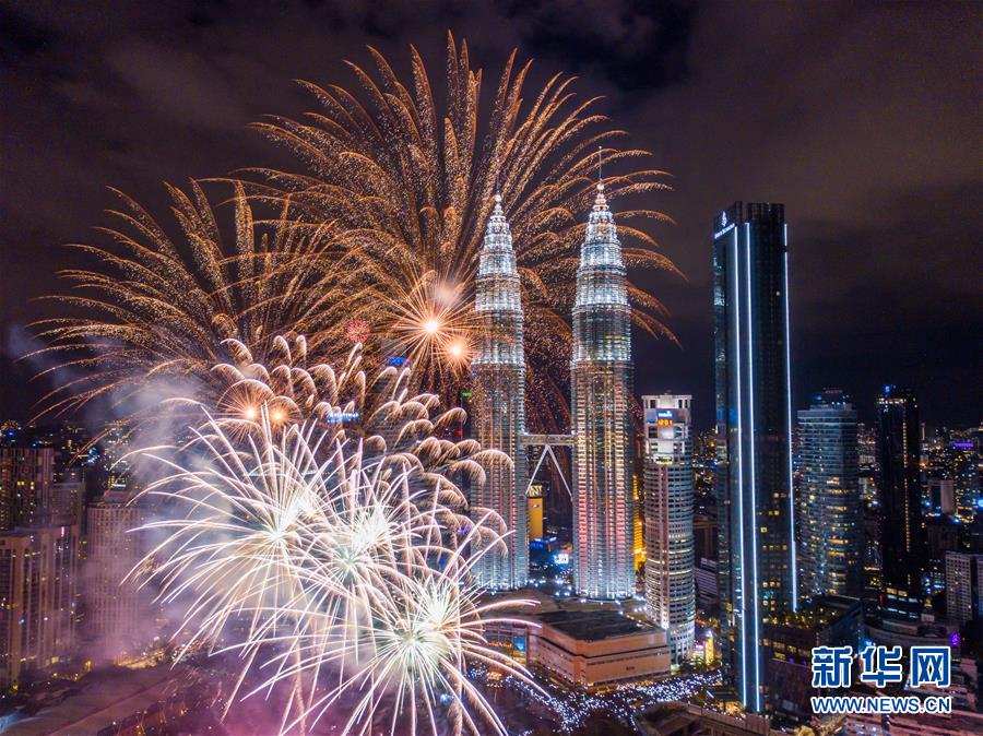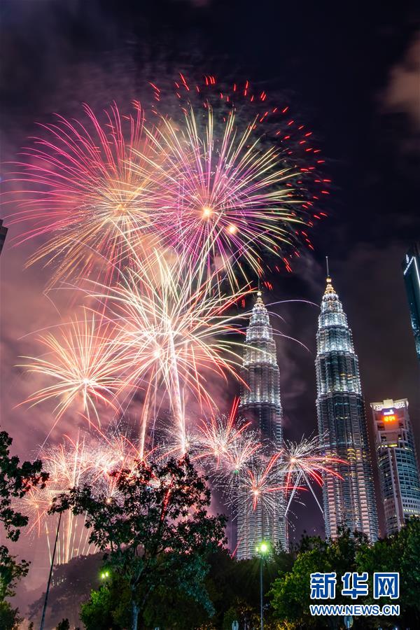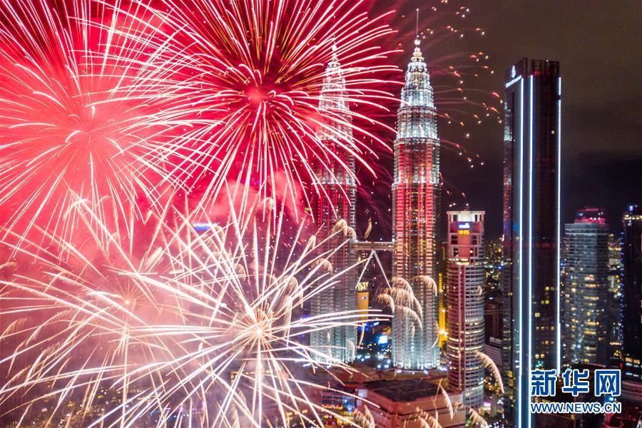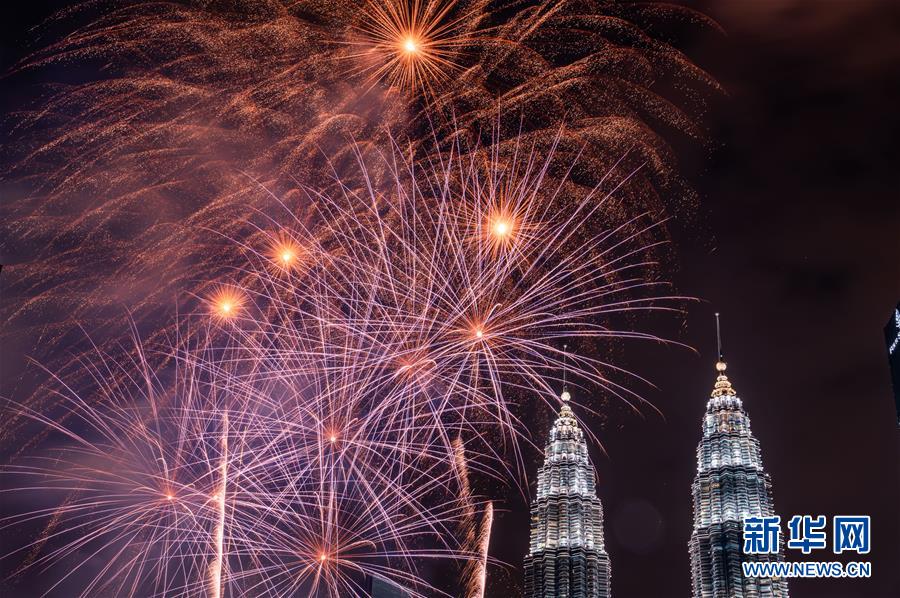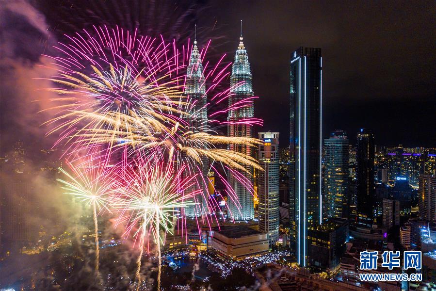 2020年1月1日,焰火在马来西亚吉隆坡的马来西亚国家石油公司双塔旁绽放,迎接新年的到来。新华社记者朱炜摄