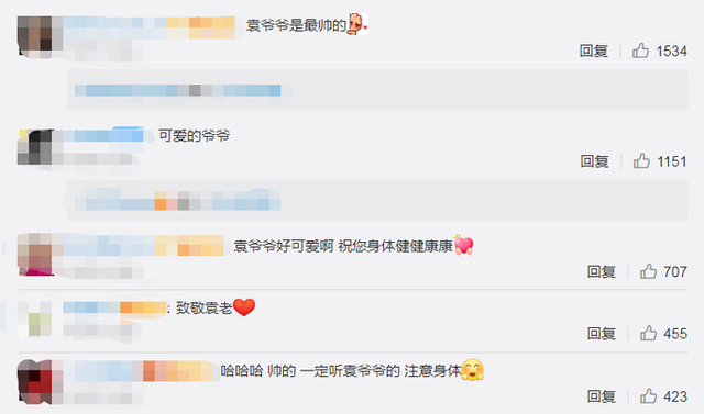 网友看后,纷纷评论,“袁爷爷是帅的”,“一定听袁爷爷话注意身体”!