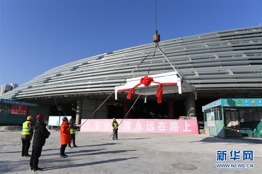 12月31日,施工人员在国家速滑馆施工现场起吊最后一块待安装的屋面单元板块。
