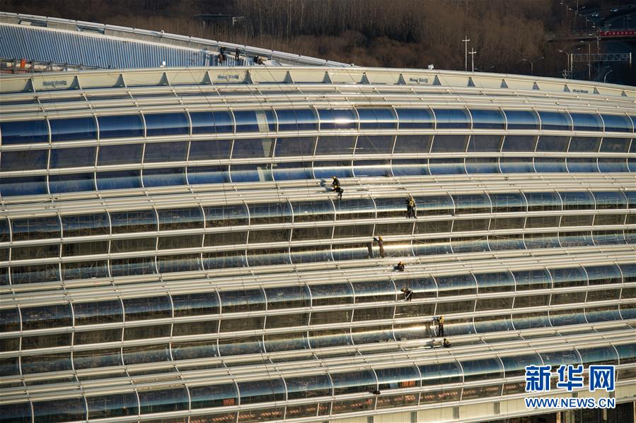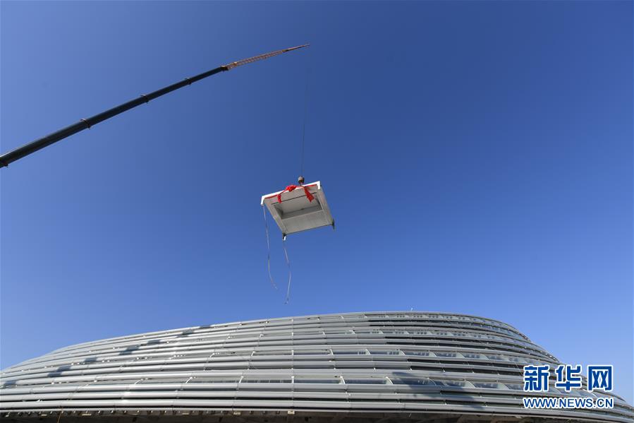 12月31日,施工人员在国家速滑馆施工现场安装最后一块屋面单元板块。新华社记者鞠焕宗摄