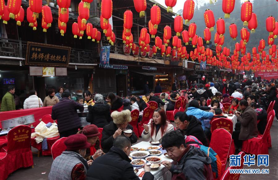 1月1日,在四川省雅安市上里古镇,人们在享用年猪宴。新华社记者 江宏景 摄