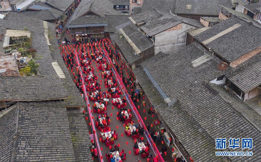 1月1日,在四川省雅安市上里古镇,人们在享用年猪宴(无人机照片)。新华社记者 江宏景 摄
