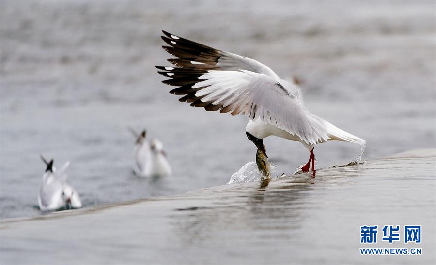 7月6日,在青海省刚察县沙柳河里,一只棕头鸥捕捉到一只跃起的湟鱼。新华社记者吴刚摄