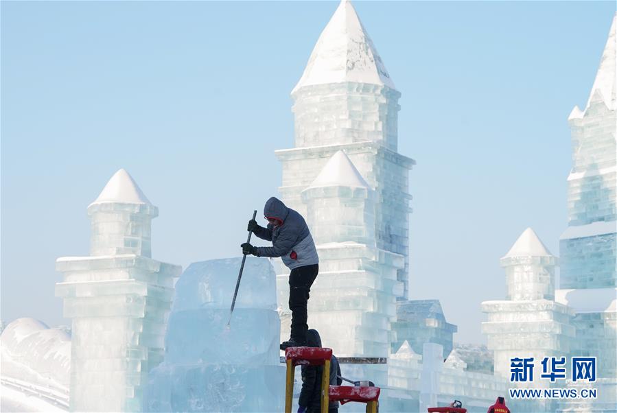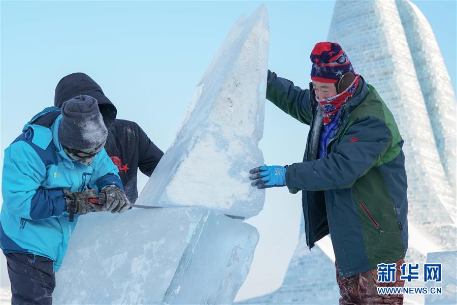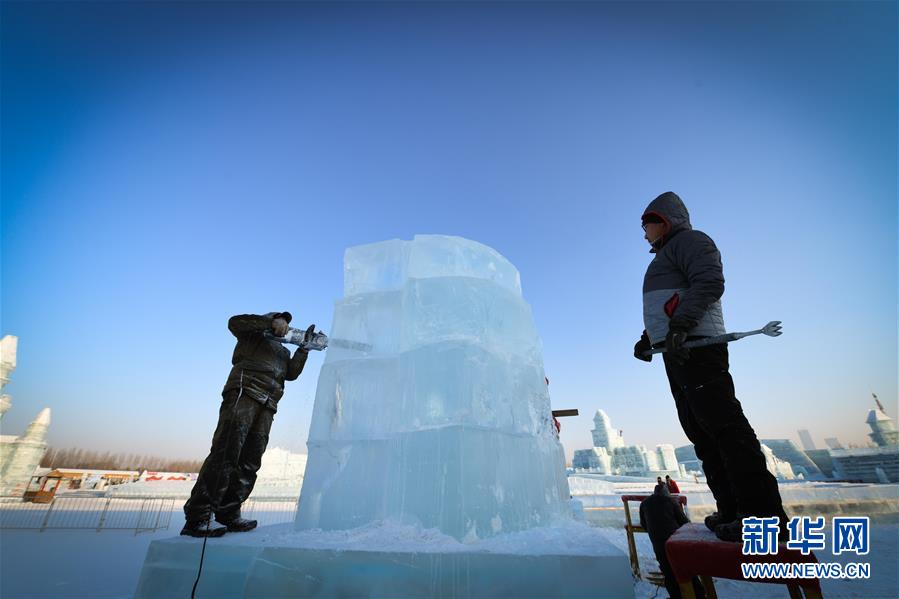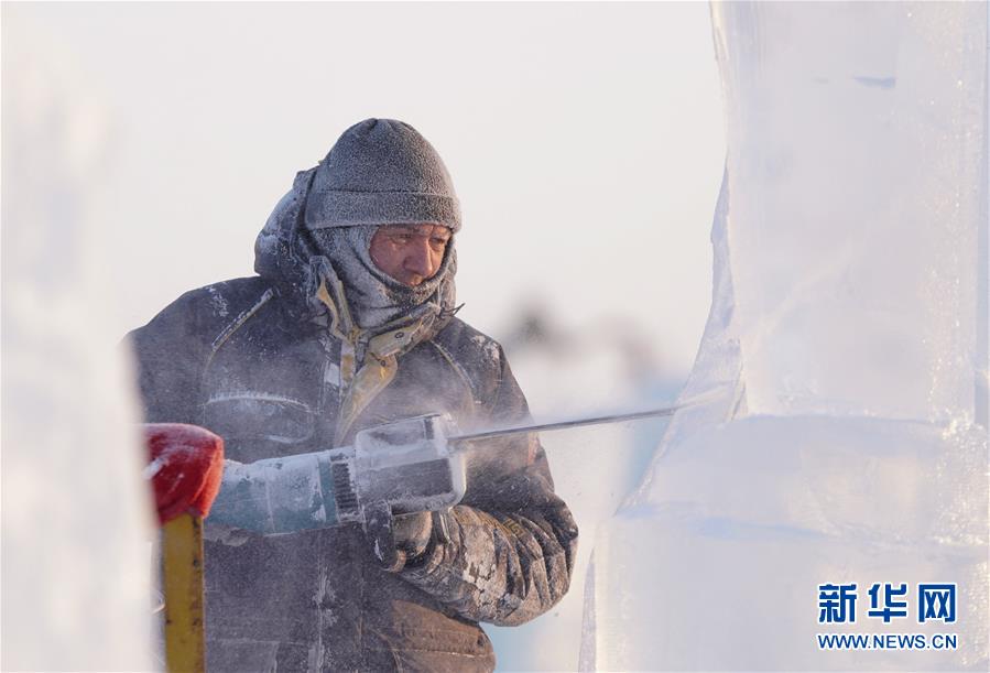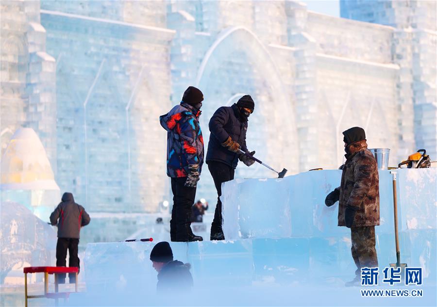 12月31日,选手在第9届中国·哈尔滨国际组合冰雕比赛中进行冰雕创作。新华社记者李建平摄
