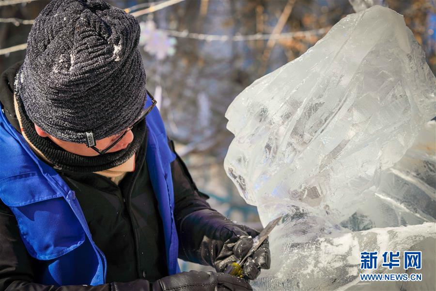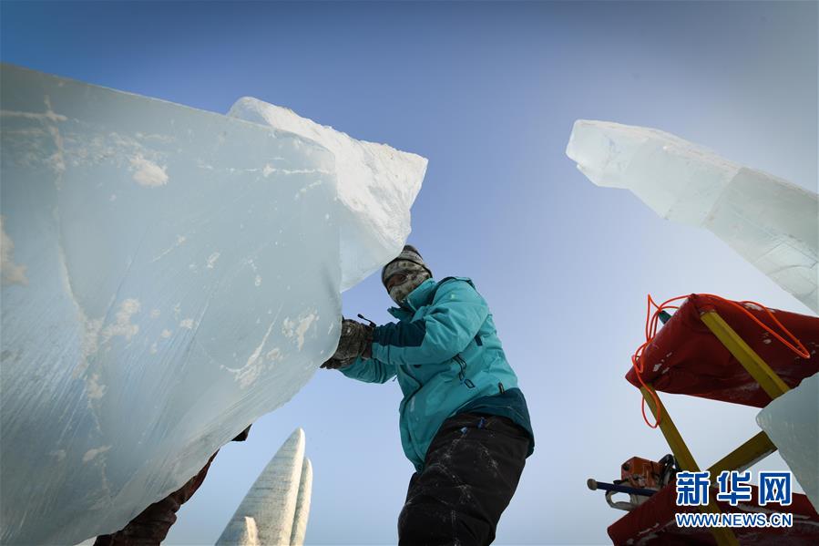 12月31日,选手在第9届中国·哈尔滨国际组合冰雕比赛中进行冰雕创作。新华社记者王松摄