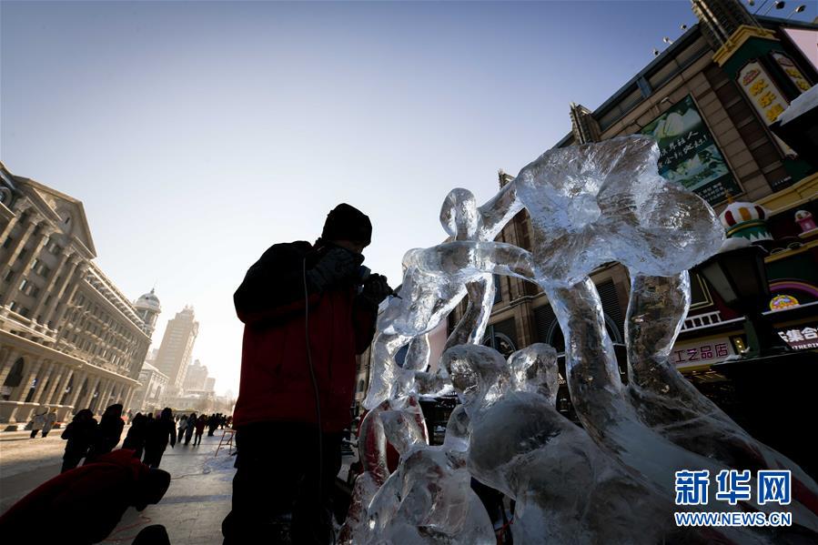 近日,在哈尔滨中央大街上,陆续创作完成的数十个冰雕景观为老街增添了新的景致,吸引众多市民和游客的目光。