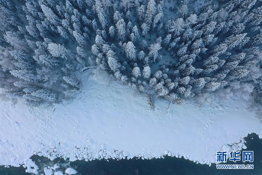 这是1月3日拍摄的喀纳斯河畔的雾凇景观(无人机照片)。新华社记者宋彦桦摄